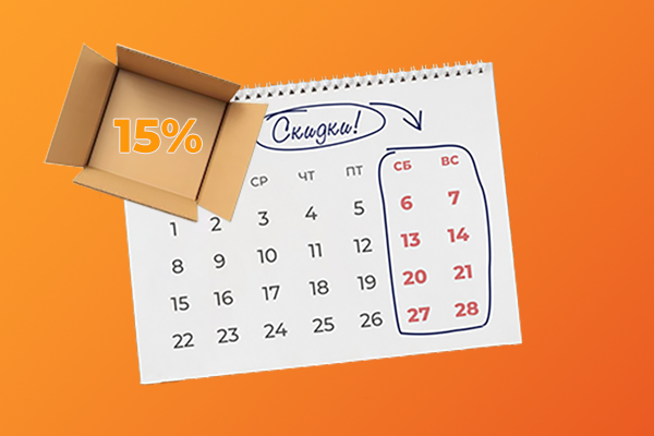 Только в выходные получите скидку 15% на качественные коробки, гофрокартон, стрейч-плёнку и многое другое при заказе от 1000 рублей!